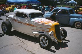 Full chopped 1934 Ford three window coupe, with a long set of flames.