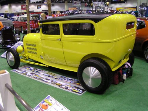 Chopped top and fenderless, with a bright yellow coat of paint are the main features of this Model A sedan. Check out the Moon discs. Sometimes the economy items really make the best statement. $20 a wheel beats a thousand!
