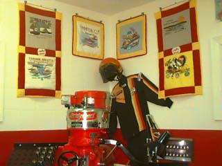 Behind the Red Bridgeport is the racing suit that was used when Wally was into boat racing in a big way. On the wall are the favorite T-Shirts of Wally's that his mom sewed into mini-quilts to use for decor in the garage. I told you that was not like your average garage. Much of the memorabilia is from Wallys racing days and thngs that are important to him from days gone by. Outside the garage is an antique gas pump, and many of the things on the wall are from the Gulf gas station that his dad used to run in the fifties.